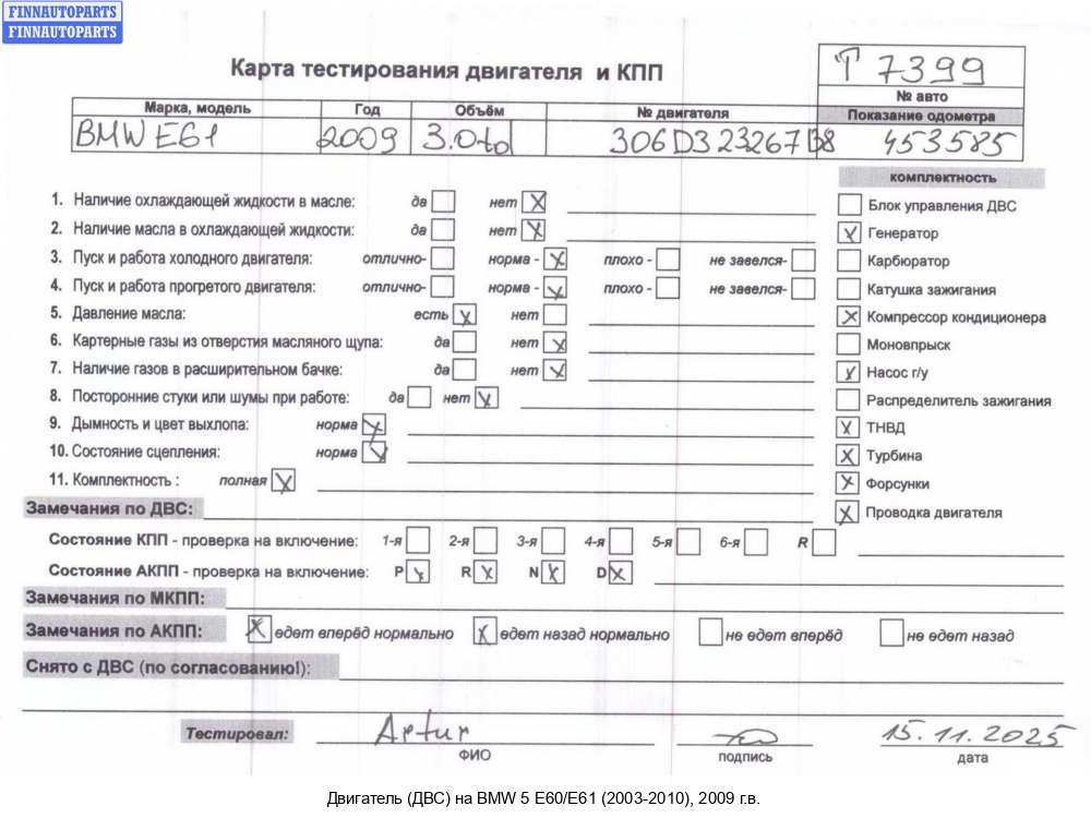 | Нижний Тагил | 2006 | 7789801, 11007789801, 2006, 2.5л, Дизель, Турбо, 256D2 / M57D25, 28346180256D2, 11007789801, 7789801, Седан, серый, 28346180256D2 | - | Г | С | Н | Т | КК, прокручивается, состояние ГРМ - нормально, поддон - нормально, клапанная крышка - нормально, эмульсия - нет, 1 массовый, | |||